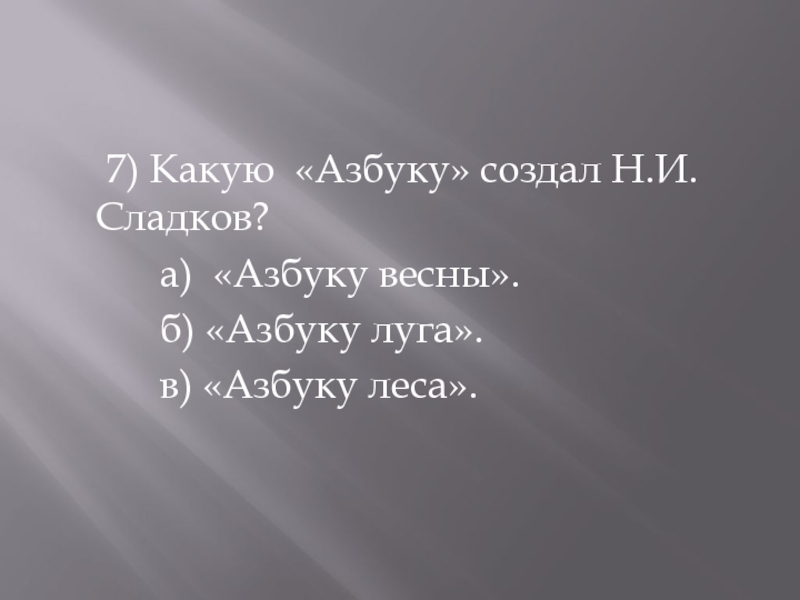 7) Какую «Азбуку» создал Н.И. Сладков?
