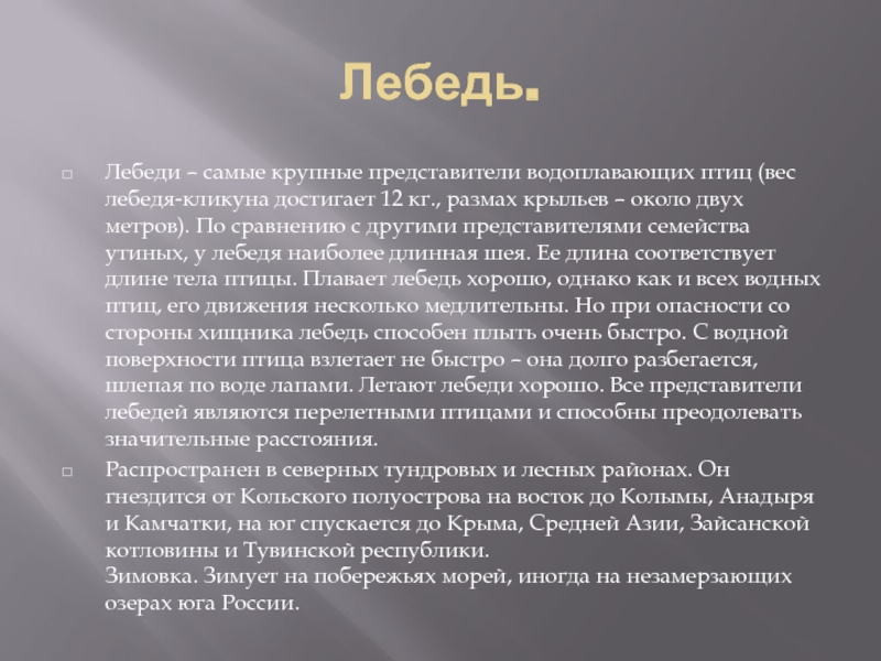 кг., размах крыльев – около двух метров). По сравнению с другими представителями семейства утиных, у лебедя наиболее длинная шея. Ее длина соответствует длине тела птицы. Плавает лебедь хорошо, однако как и всех водных птиц, его движения несколько медлительны. Но при опасности со стороны хищника лебедь способен плыть очень быстро. С водной поверхности птица взлетает не быстро – она долго разбегается, шлепая по воде лапами. Летают лебеди хорошо. Все представители лебедей являются перелетными птицами и способны преодолевать значительные расстояния.