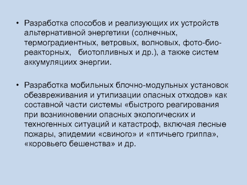 Слайд 4Разработка способов и реализующих их устройств альтернативной энергетики (солнечных, термоградиентных, ветровых,