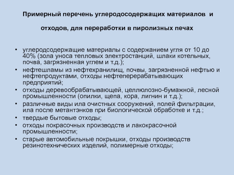 Слайд 12 Примерный перечень углеродосодержащих материалов и отходов, для переработки в пиролизных