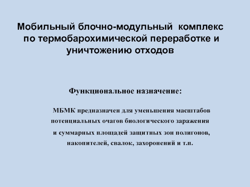Разработка мобильных блочно-модульных установок обезвреживания и утилизации опасных отходов» как составной части системы «быстрого реагирования при возникновении опасных экологических и техногенных ситуаций и катастроф, включая лесные пожары, эпидемии «свиного» и «птичьего гриппа», «коровьего бешенства» и др.