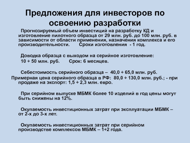 и изготовление пилотного образца от 29 млн. руб. до 100 млн. руб. в зависимости от области применения, назначения комплекса и его производительности. Сроки изготовления - 1 год.
