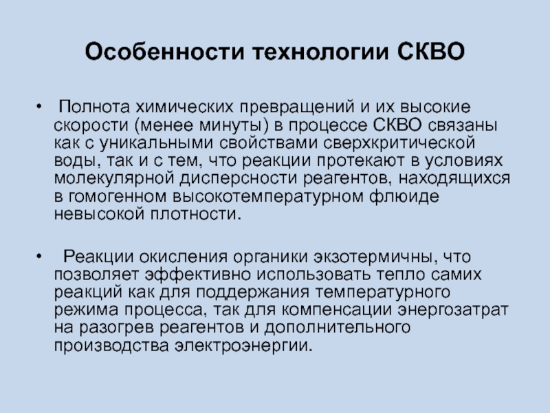 минуты) в процессе СКВО связаны как с уникальными свойствами сверхкритической воды, так и с тем, что реакции протекают в условиях молекулярной дисперсности реагентов, находящихся в гомогенном высокотемпературном флюиде невысокой плотности.