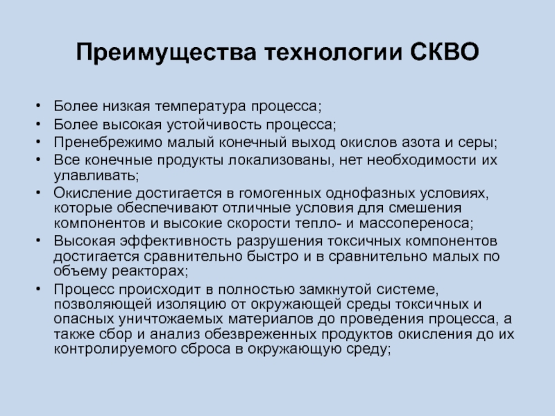 Процесс происходит в полностью замкнутой системе, позволяющей изоляцию от окружающей среды токсичных и опасных уничтожаемых материалов до проведения процесса, а также сбор и анализ обезвреженных продуктов окисления до их контролируемого сброса в окружающую среду;