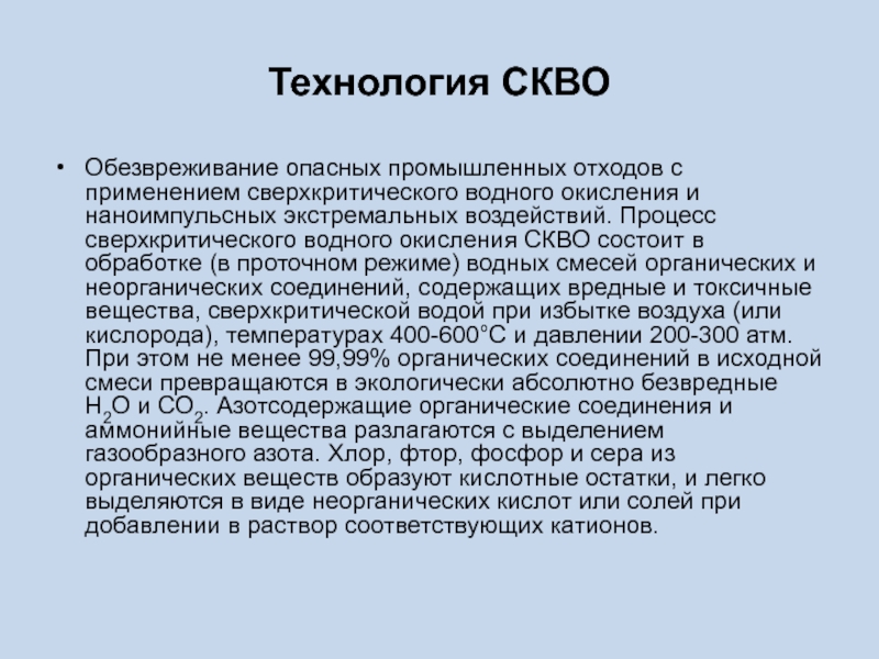 наноимпульсных экстремальных воздействий. Процесс сверхкритического водного окисления СКВО состоит в обработке (в проточном режиме) водных смесей органических и неорганических соединений, содержащих вредные и токсичные вещества, сверхкритической водой при избытке воздуха (или кислорода), температурах 400-600°С и давлении 200-300 атм. При этом не менее 99,99% органических соединений в исходной смеси превращаются в экологически абсолютно безвредные Н2О и СО2. Азотсодержащие органические соединения и аммонийные вещества разлагаются с выделением газообразного азота. Хлор, фтор, фосфор и сера из органических веществ образуют кислотные остатки, и легко выделяются в виде неорганических кислот или солей при добавлении в раствор соответствующих катионов.