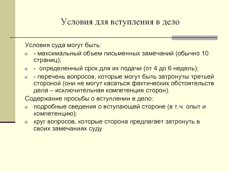 - перечень вопросов, которые могут быть затронуты третьей стороной (они не могут касаться фактических обстоятельств дела – исключительная компетенция сторон).