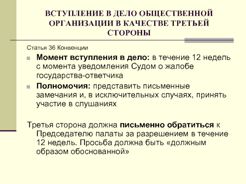 Слайд 12ВСТУПЛЕНИЕ В ДЕЛО ОБЩЕСТВЕННОЙ ОРГАНИЗАЦИИ В КАЧЕСТВЕ ТРЕТЬЕЙ СТОРОНЫ