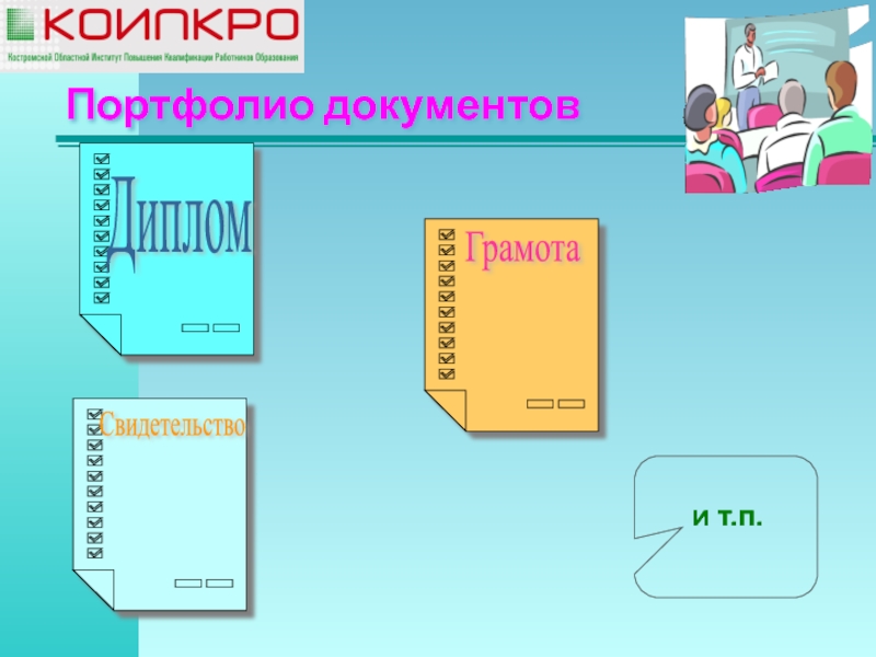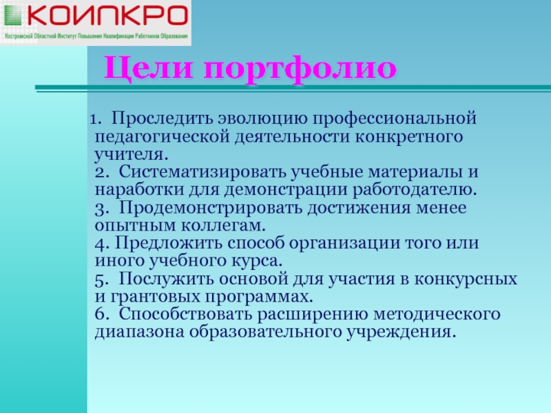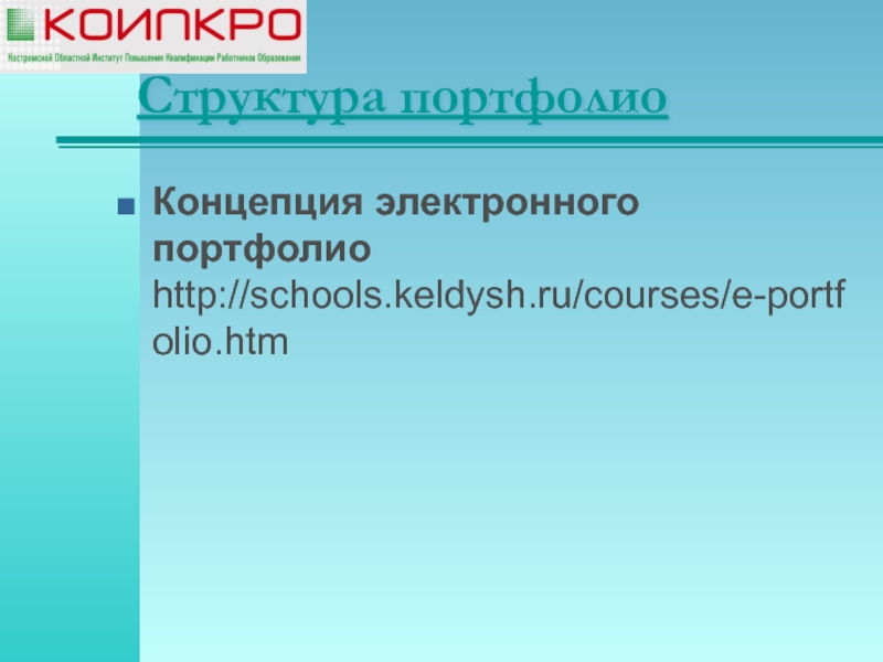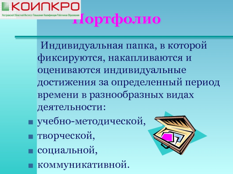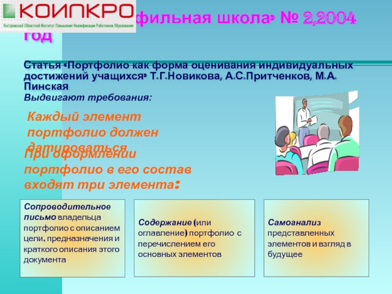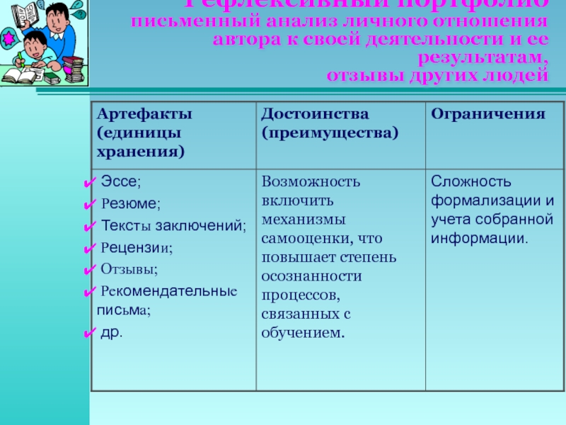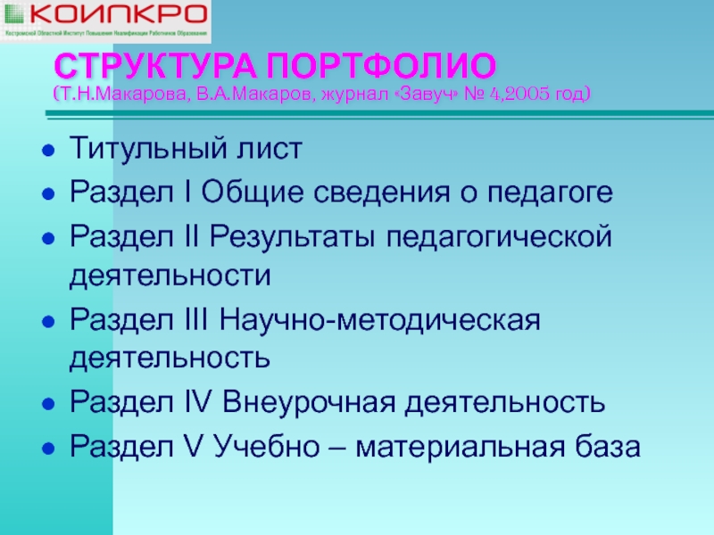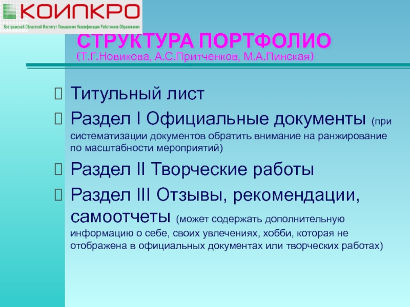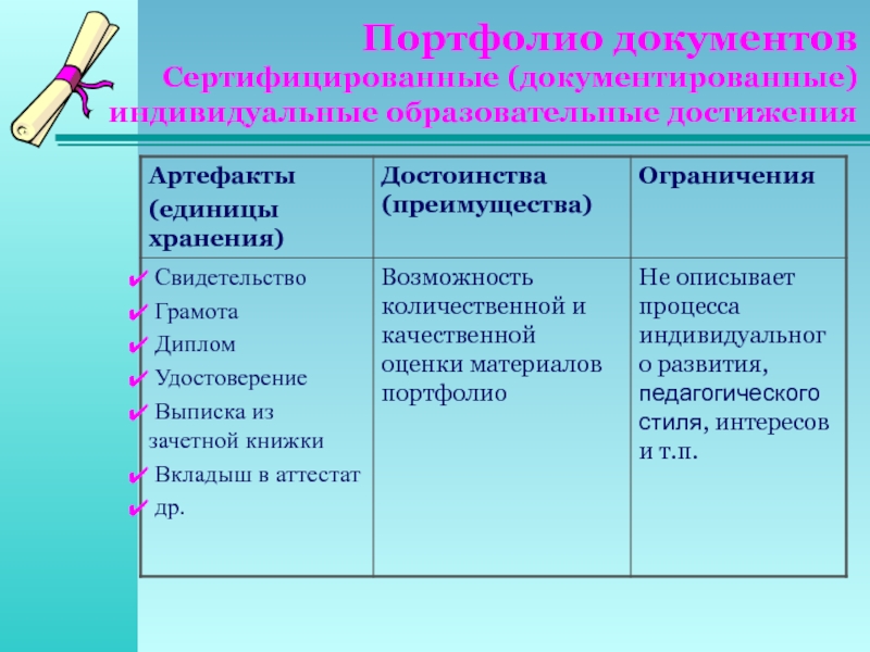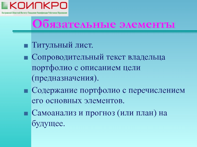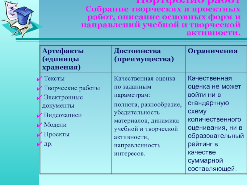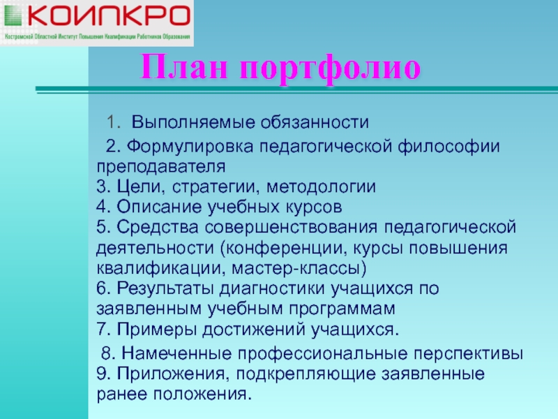 Содержание (или оглавление) портфолио с перечислением его основных элементов