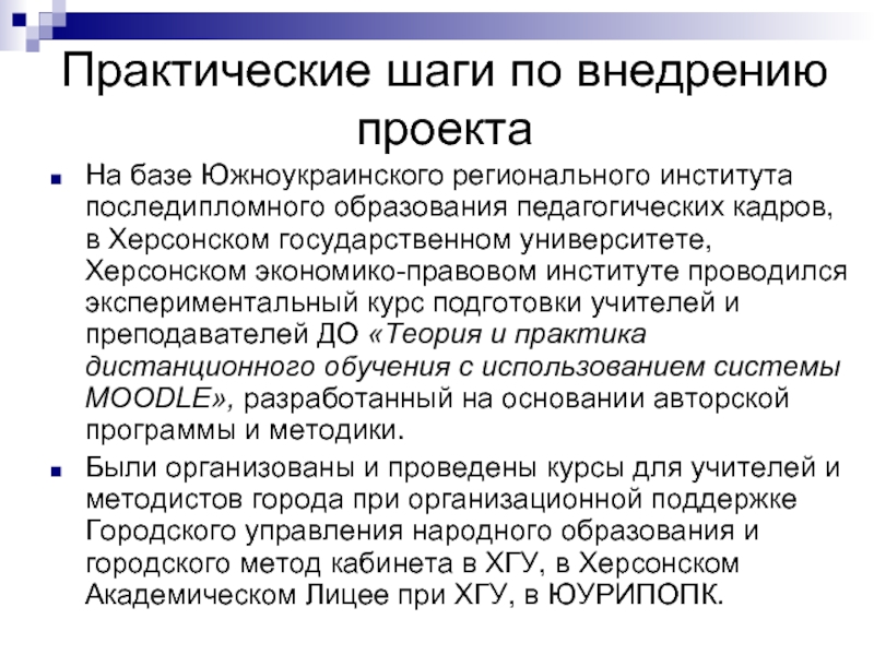 педагогических кадров, в Херсонском государственном университете, Херсонском экономико-правовом институте проводился экспериментальный курс подготовки учителей и преподавателей ДО «Теория и практика дистанционного обучения с использованием системы MOODLE», разработанный на основании авторской программы и методики.