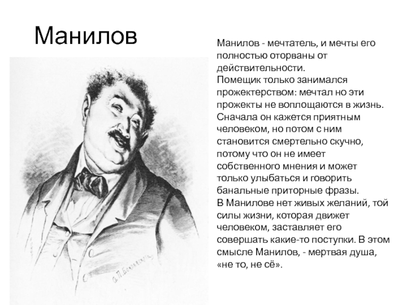 В Манилове нет живых желаний, той силы жизни, которая движет человеком, заставляет его совершать какие-то поступки. В этом смысле Манилов, - мертвая душа, «не то, не сё».