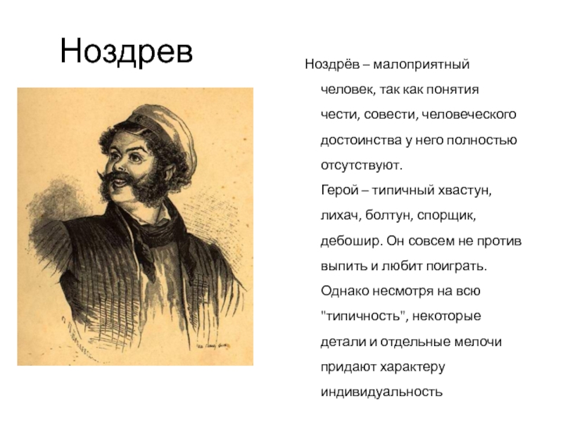 Ноздрёв – малоприятный человек, так как понятия чести, совести, человеческого достоинства