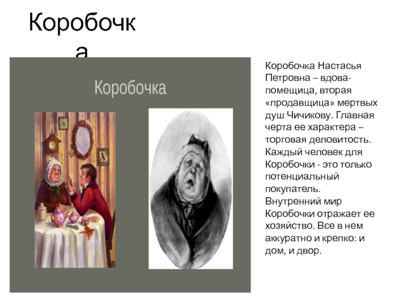 Коробочка Настасья Петровна – вдова-помещица, вторая «продавщица» мертвых душ Чичикову. Главная