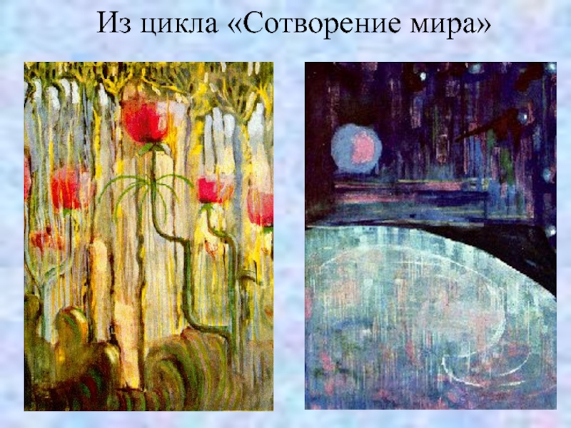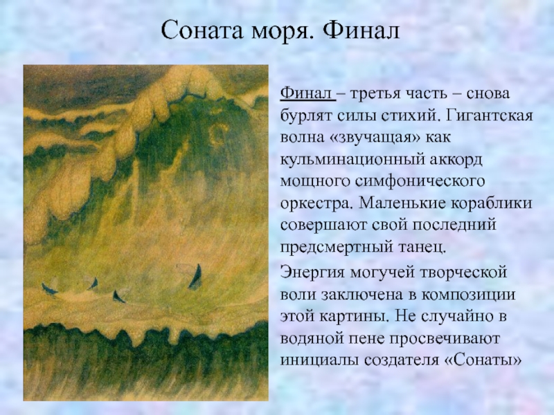 Третья часть картины - реприза - очень четко отграничена. Для нее художник приберег, точно так же, как это делается и в музыке, более сильные и конструктивные приемы - стретту и одновременно зеркальное отражение темы. Вопреки реальным, оптическим законам, елочки отражаются при этом не точно друг против друга, а со сдвигом, подобно темам в музыке фуги