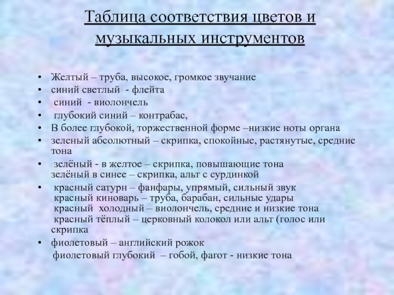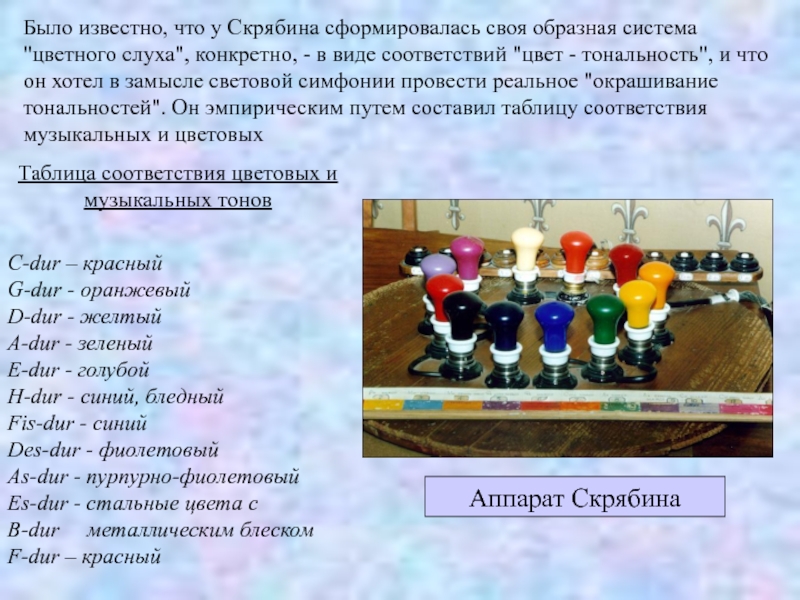 Было известно, что у Скрябина сформировалась своя образная система "цветного слуха", конкретно, - в виде соответствий "цвет – тональность. Он эмпирическим путем составил таблицу соответствия музыкальных и цветовых