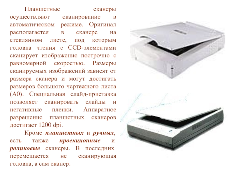 Сканеры разделяют на ручные и планшетные. Ручные сканеры – это относительно недорогие устройства небольшого размера, удобны для оперативного сканирования изображений из книг, журналов. Ширина полосы сканирования обычно не превышает 105 мм, стандартное разрешение 600 dpi. К не-достаткам ручного сканера можно отнести зависимость качества сканирования от навыков пользователя и невозможность одновременного сканирования относительно больших изображений.