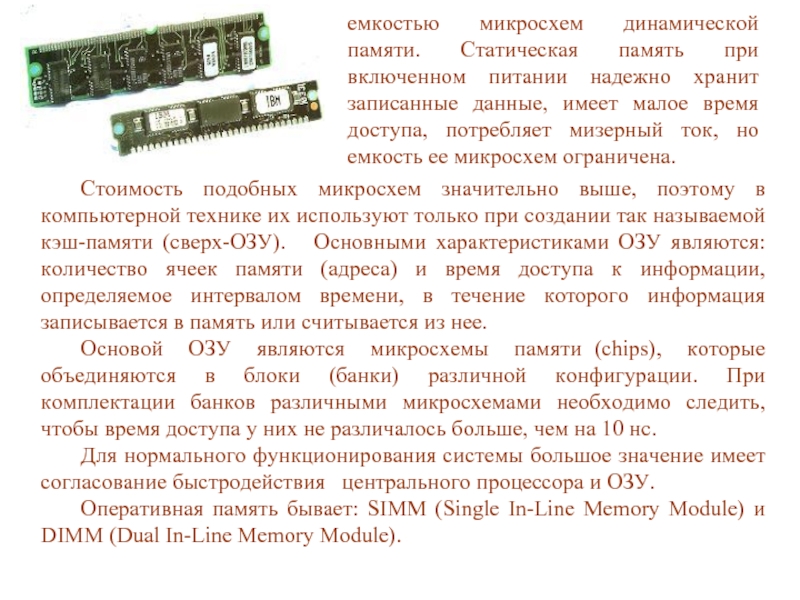 емкостью микросхем динамической памяти. Статическая память при включенном питании надежно хранит записанные данные, имеет малое время доступа, потребляет мизерный ток, но емкость ее микросхем ограничена.