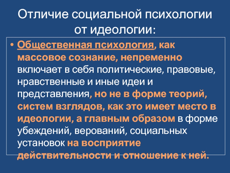 Идеология – это система взглядов, идей, теорий, отражающая социально-экономические условия жизни людей и выражающая коренные интересы классов. Идеология представляет собой теоретическое специализированное сознание, которое разрабатывается специалистами.