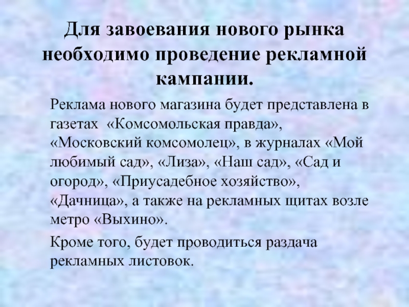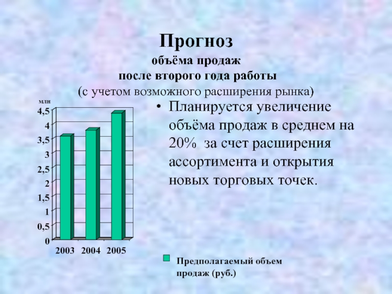 Планируется увеличение объёма продаж в среднем на 20% за счет расширения ассортимента и открытия новых торговых точек.