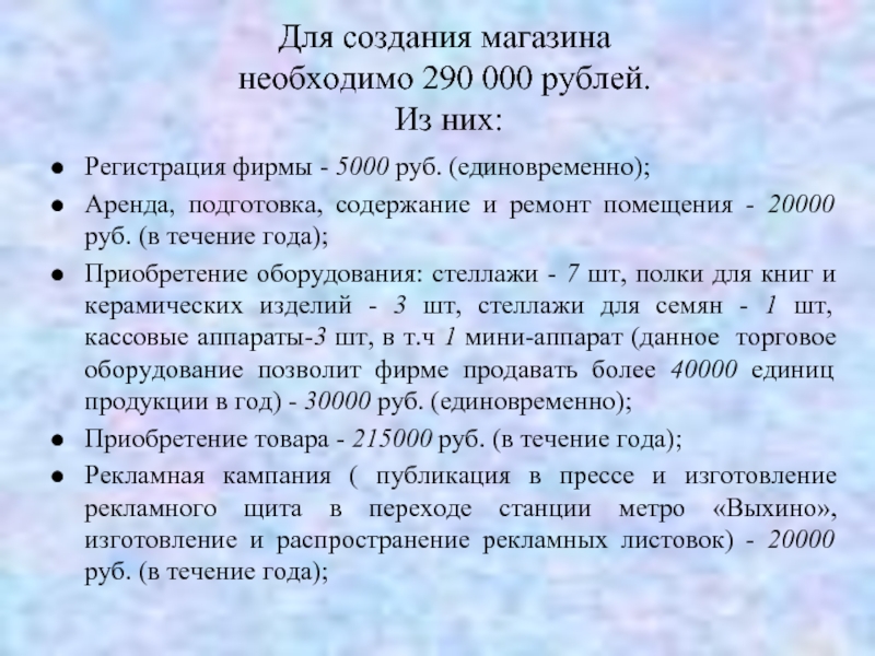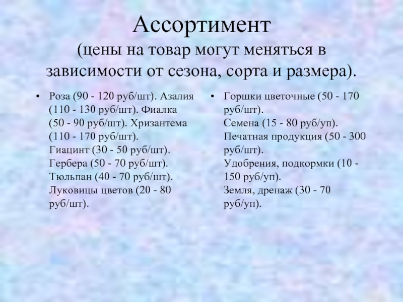 Горшки цветочные (50 - 170 руб/шт). Семена (15 - 80 руб/уп). Печатная продукция (50 - 300 руб/шт). Удобрения, подкормки (10 - 150 руб/уп). Земля, дренаж (30 - 70 руб/уп).