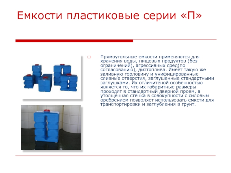 ограничений), агрессивных сред(по согласованию), дизтоплива. Имеет такую же заливную горловину и унифицированные сливные отверстия, заглушенные стандартными заглушками. Их отличитеной особенностью является то, что их габаритные размеры проходят в стандартный дверной проем, а утолщенная стенка в совокупности с силовым оребрением позволяет использовать емксти для транспортировки и заглубления в грунт.