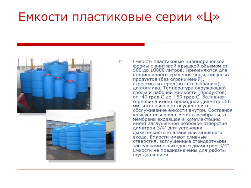 от 500 до 10000 литров. Применяются для стационарного хранения воды, пищевых продуктов (без ограничений), агрессивных сред(по согласованию), дизтоплива. Температура окружающей среды и рабочей жидкости (продуктов) от -40 град.С до +50 град.С. Заливная горловина имеет проходной диаметр 356 мм, что позволяет осуществлять обслуживание емкости внутри. Составная крышка позволяет менять мембраны, а мембрана входящая в комплектацию имеет заглушенное резбовое отверстие диметром 3/4" для установки дыхательного клапана или заливного входа. Емкости имеют сливные отверстия, заглушенные стандартными заглушками с выходным диаметром 3/4". Емкости не предназначены для работы под давлением.