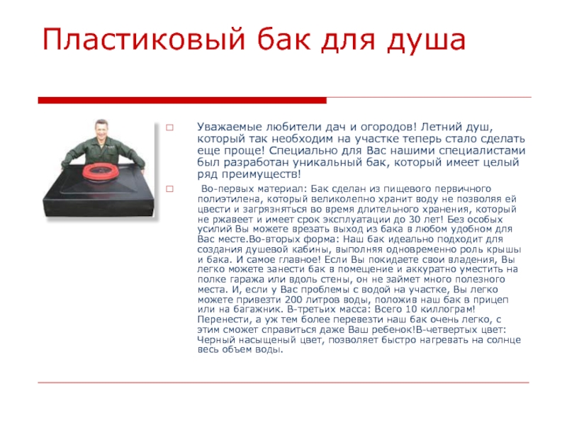 Во-первых материал: Бак сделан из пищевого первичного полиэтилена, который великолепно хранит воду не позволяя ей цвести и загрязняться во время длительного хранения, который не ржавеет и имеет срок эксплуатации до 30 лет! Без особых усилий Вы можете врезать выход из бака в любом удобном для Вас месте.Во-вторых форма: Наш бак идеально подходит для создания душевой кабины, выполняя одновременно роль крышы и бака. И самое главное! Если Вы покидаете свои владения, Вы легко можете занести бак в помещение и аккуратно уместить на полке гаража или вдоль стены, он не займет много полезного места. И, если у Вас проблемы с водой на участке, Вы легко можете привезти 200 литров воды, положив наш бак в прицеп или на багажник. В-третьих масса: Всего 10 киллограм! Перенести, а уж тем более перевезти наш бак очень легко, с этим сможет справиться даже Ваш ребенок!В-четвертых цвет: Черный насыщеный цвет, позволяет быстро нагревать на солнце весь объем воды.