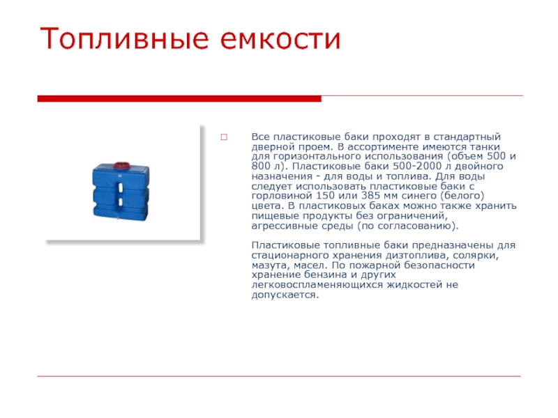 имеются танки для горизонтального использования (объем 500 и 800 л). Пластиковые баки 500-2000 л двойного назначения - для воды и топлива. Для воды следует использовать пластиковые баки с горловиной 150 или 385 мм синего (белого) цвета. В пластиковых баках можно также хранить пищевые продукты без ограничений, агрессивные среды (по согласованию).