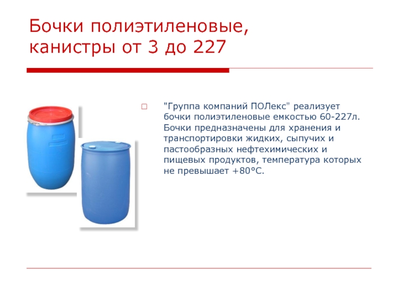 60-227л. Бочки предназначены для хранения и транспортировки жидких, сыпучих и пастообразных нефтехимических и пищевых продуктов, температура которых не превышает +80°С.