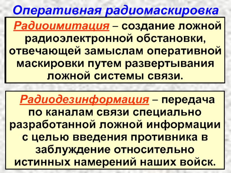 Радиоимитация – создание ложной радиоэлектронной обстановки, отвечающей замыслам оперативной маскировки путем развертывания ложной системы связи.