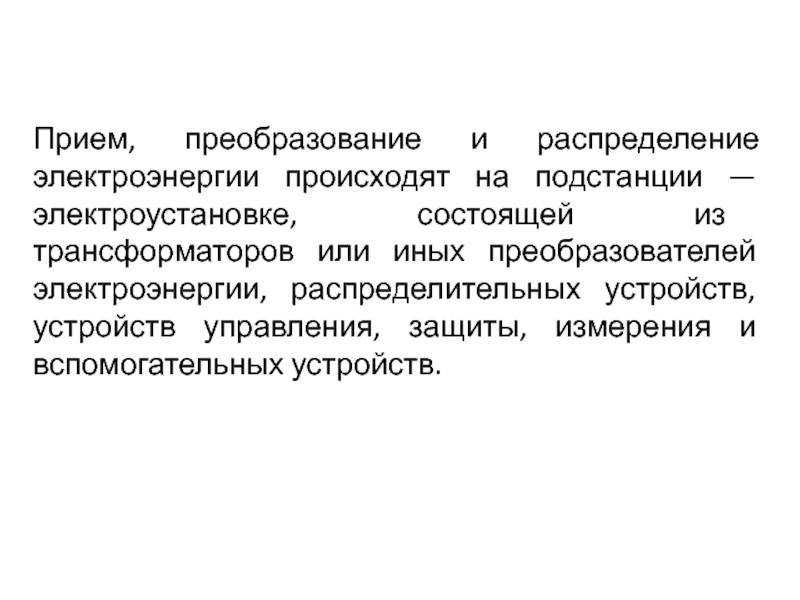 Слайд 6Прием, преобразование и распределение электроэнергии происходят на подстанции — электроустановке, состоящей