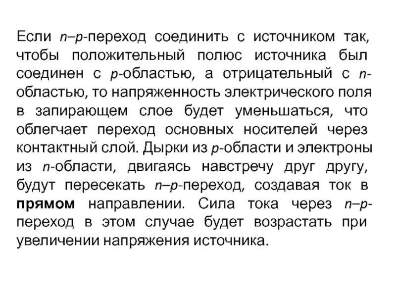 соединен с p-областью, а отрицательный с n-областью, то напряженность электрического поля в запирающем слое будет уменьшаться, что облегчает переход основных носителей через контактный слой. Дырки из p-области и электроны из n-области, двигаясь навстречу друг другу, будут пересекать n–p-переход, создавая ток в прямом направлении. Сила тока через n–p-переход в этом случае будет возрастать при увеличении напряжения источника.