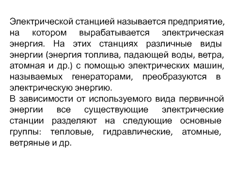 Слайд 3Электрической станцией называется предприятие, на котором вырабатывается электрическая энергия. На этих