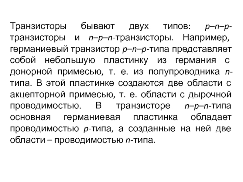 Слайд 36Транзисторы бывают двух типов: p–n–p-транзисторы и n–p–n-транзисторы. Например, германиевый транзистор p–n–p-типа
