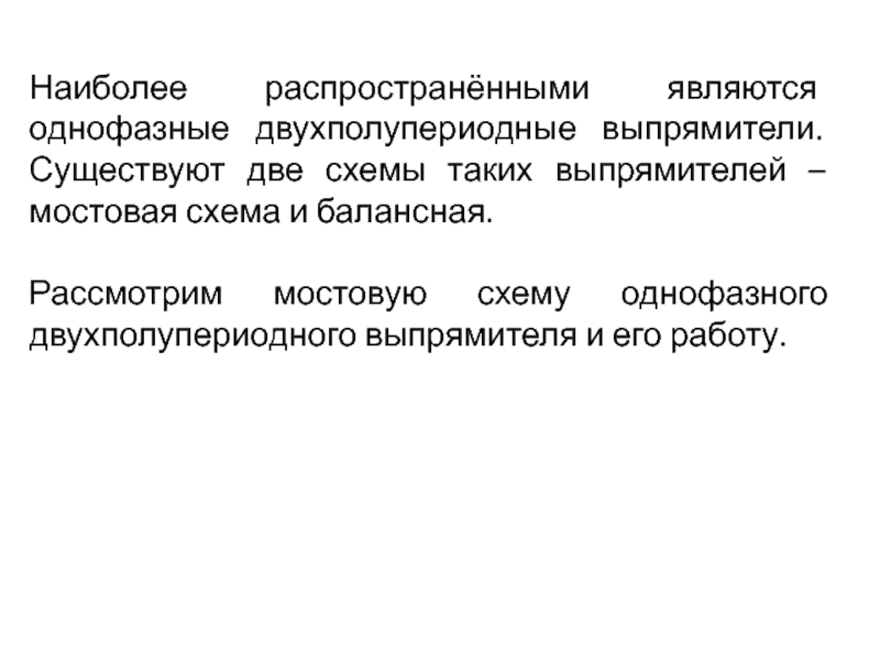 Слайд 28Наиболее распространёнными являются однофазные двухполупериодные выпрямители. Существуют две схемы таких выпрямителей