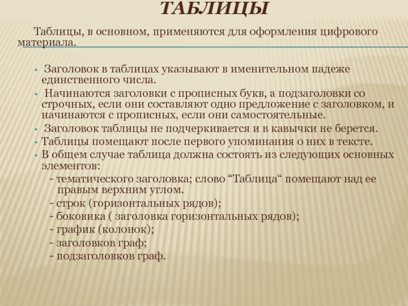 - тематического заголовка; слово “Таблица“ помещают над ее правым верхним углом.
