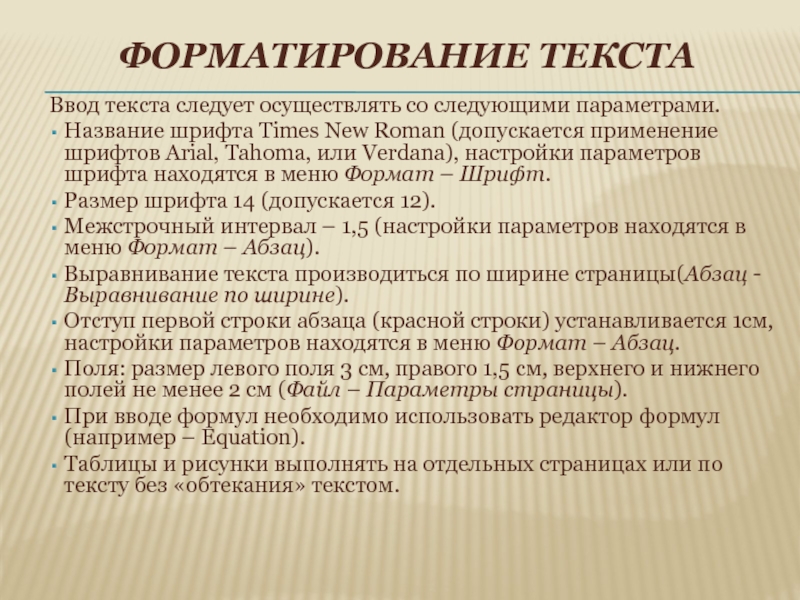 Roman (допускается применение шрифтов Arial, Tahoma, или Verdana), настройки параметров шрифта находятся в меню Формат – Шрифт.