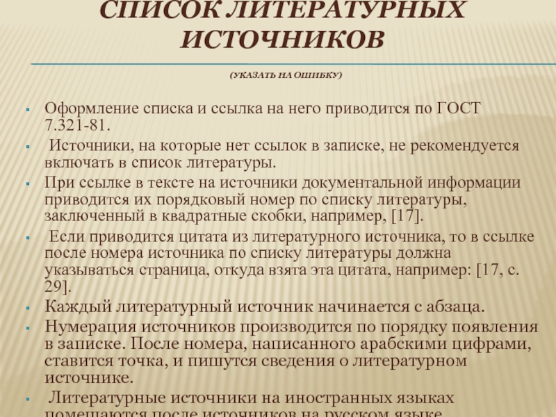 При ссылке в тексте на источники документальной информации приводится их порядковый номер по списку литературы, заключенный в квадратные скобки, например, [17].
