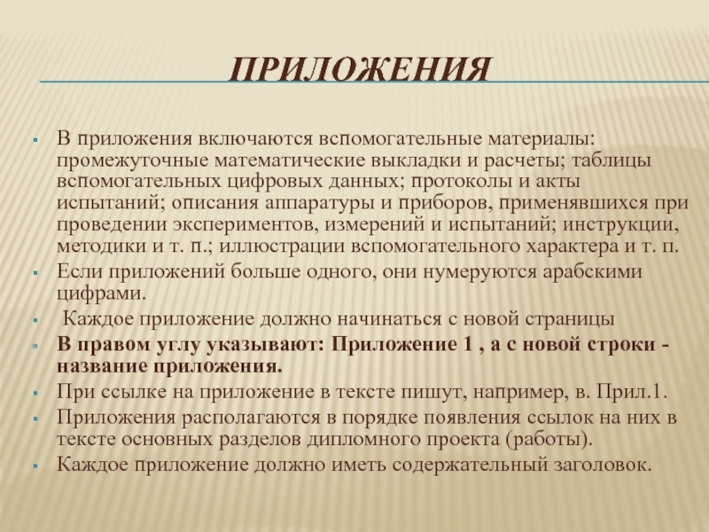 В приложения включаются вспомогательные материалы: промежуточные математические выкладки и расчеты; таблицы