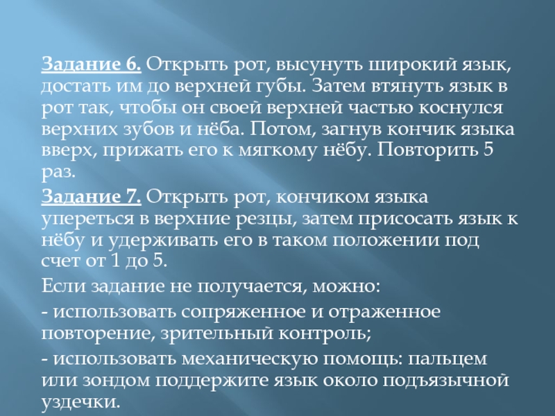 Задание 7. Открыть рот, кончиком языка упереться в верхние резцы, затем присосать язык к нёбу и удерживать его в таком положении под счет от 1 до 5.