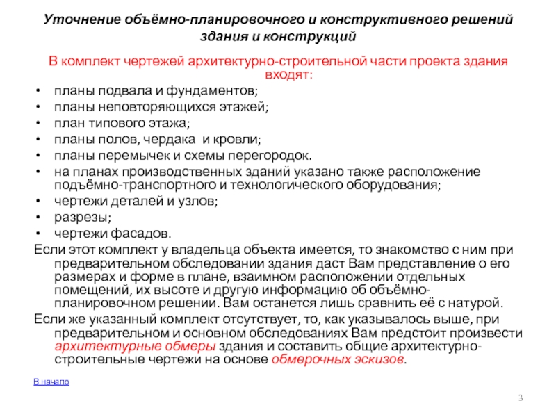 Если этот комплект у владельца объекта имеется, то знакомство с ним при предварительном обследовании здания даст Вам представление о его размерах и форме в плане, взаимном расположении отдельных помещений, их высоте и другую информацию об объёмно-планировочном решении. Вам останется лишь сравнить её с натурой.