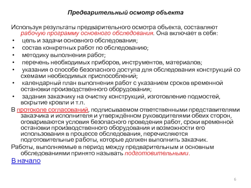 Используя результаты предварительного осмотра объекта, составляют рабочую программу основного
