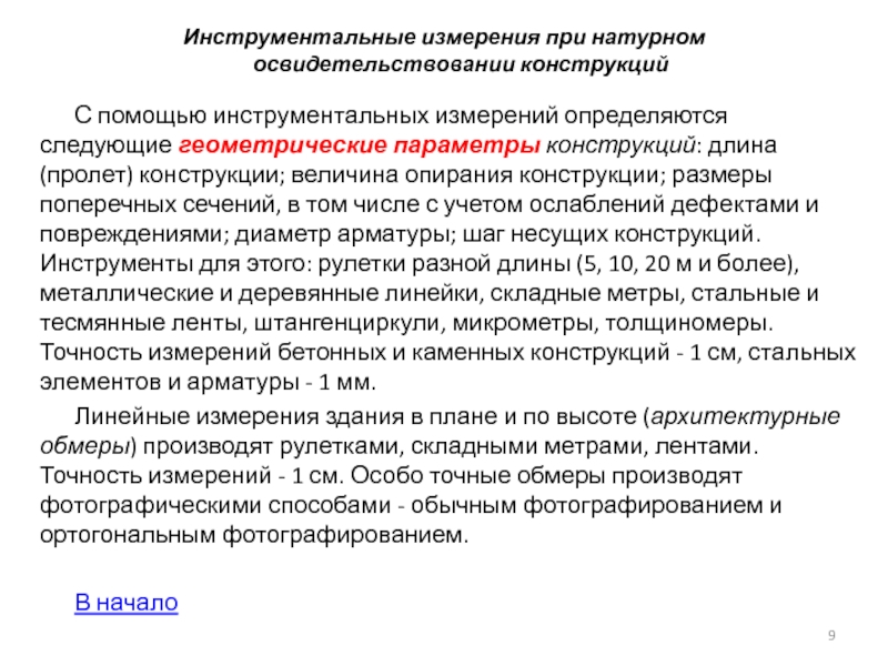 параметры конструкций: длина (пролет) конструкции; величина опирания конструкции; размеры поперечных сечений, в том числе с учетом ослаблений дефектами и повреждениями; диаметр арматуры; шаг несущих конструкций. Инструменты для этого: рулетки разной длины (5, 10, 20 м и более), металлические и деревянные линейки, складные метры, стальные и тесмянные ленты, штангенциркули, микрометры, толщиномеры. Точность измерений бетонных и каменных конструкций - 1 см, стальных элементов и арматуры - 1 мм.