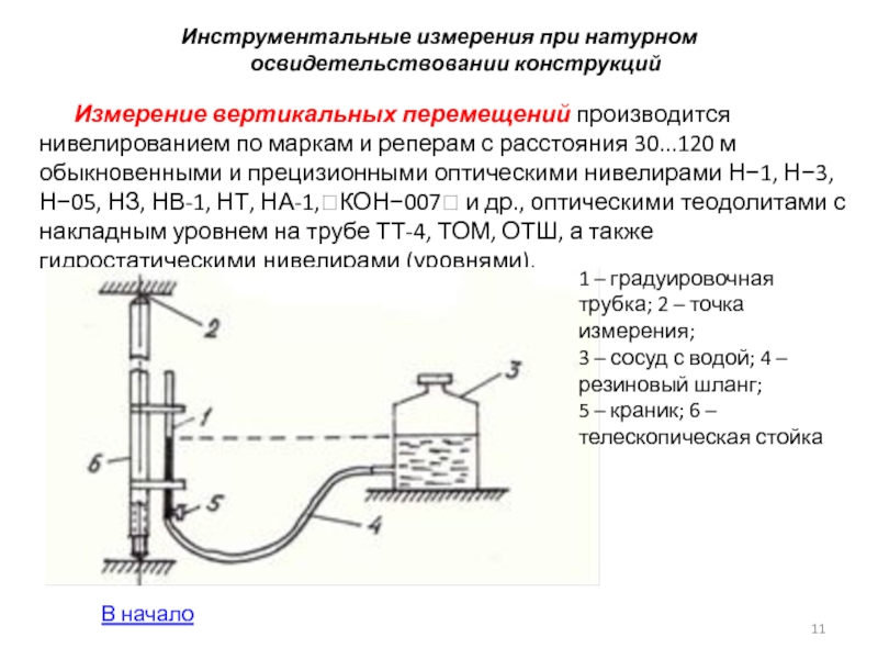 и реперам с расстояния 30...120 м обыкновенными и прецизионными оптическими нивелирами Н−1, Н−3, Н−05, НЗ, НВ-1, НТ, НА-1,КОН−007 и др., оптическими теодолитами с накладным уровнем на трубе ТТ-4, ТОМ, ОТШ, а также гидростатическими нивелирами (уровнями).