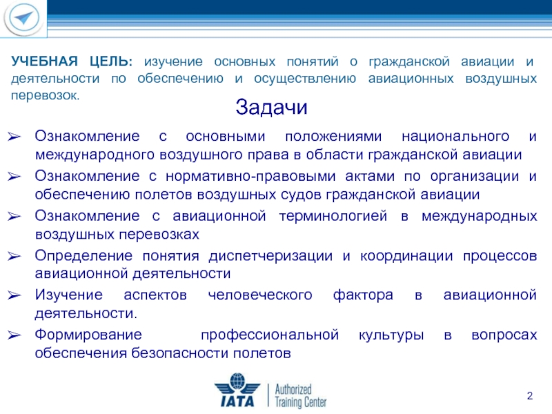 УЧЕБНАЯ ЦЕЛЬ: изучение основных понятий о гражданской авиации и деятельности по обеспечению и осуществлению авиационных воздушных перевозок.