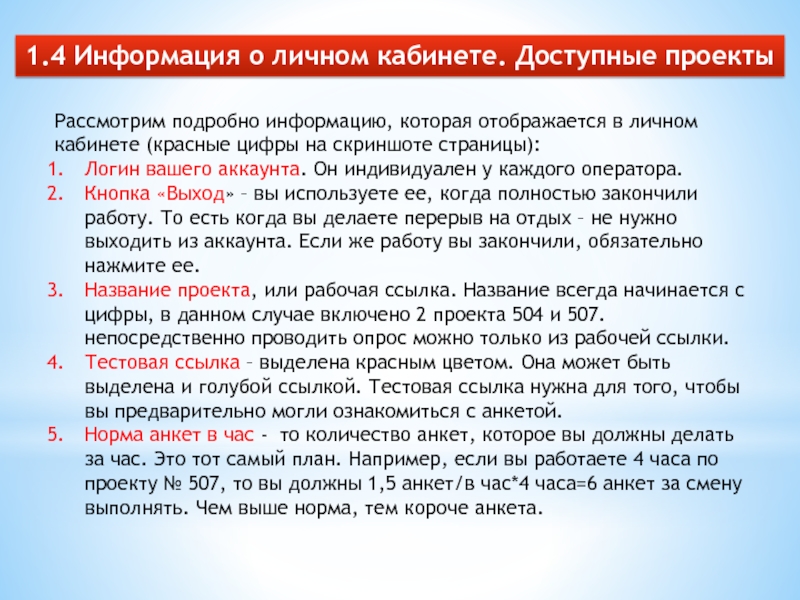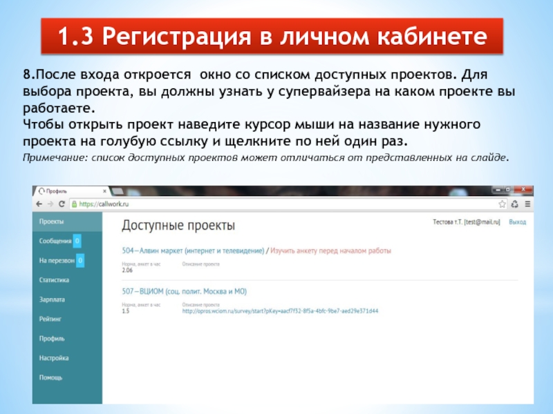 Слайд 141.4 Информация о личном кабинете. Доступные проекты