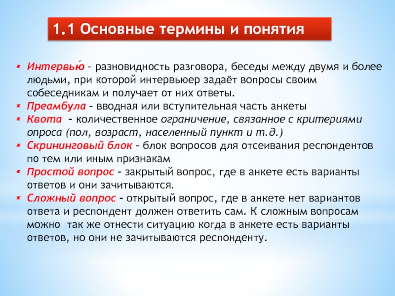 Сложный вопрос - открытый вопрос, где в анкете нет вариантов ответа и респондент должен ответить сам. К сложным вопросам можно так же отнести ситуацию когда в анкете есть варианты ответов, но они не зачитываются респонденту.