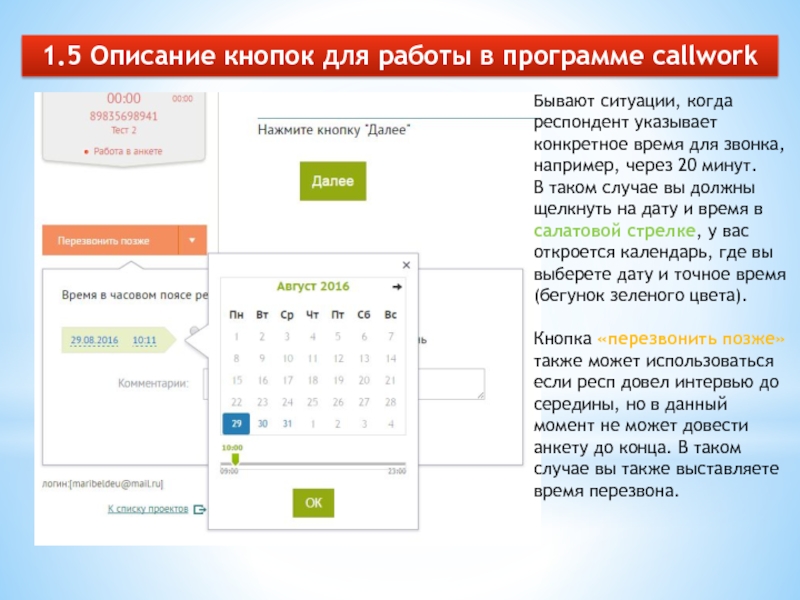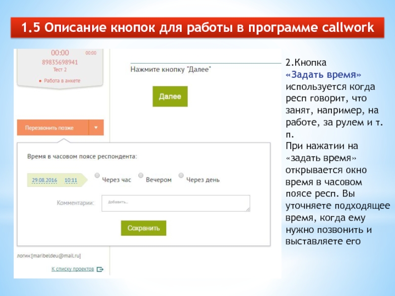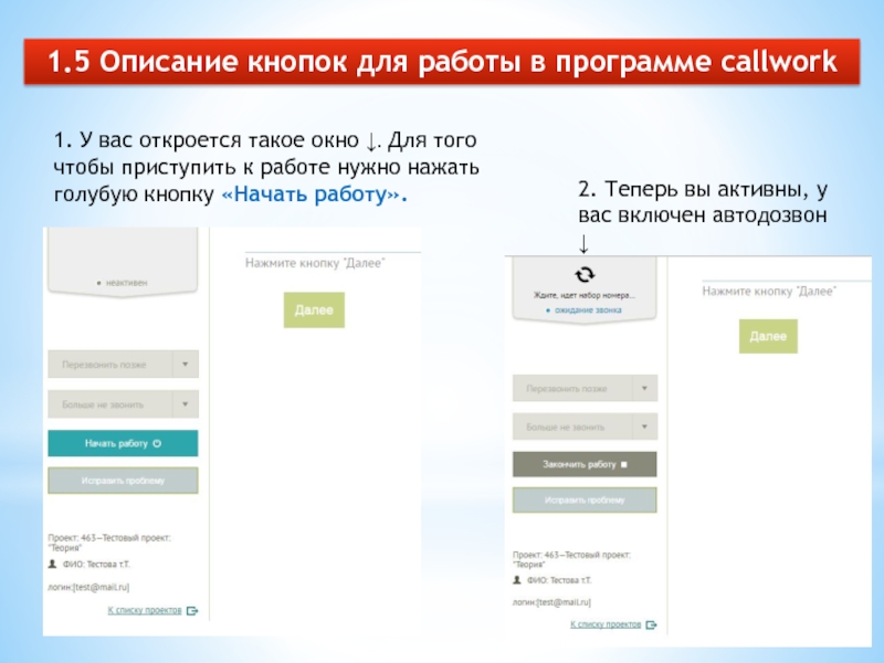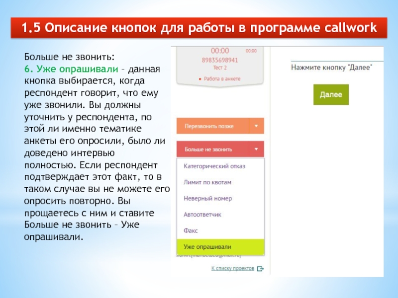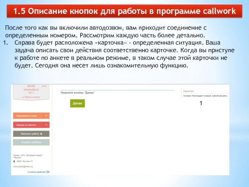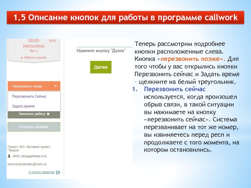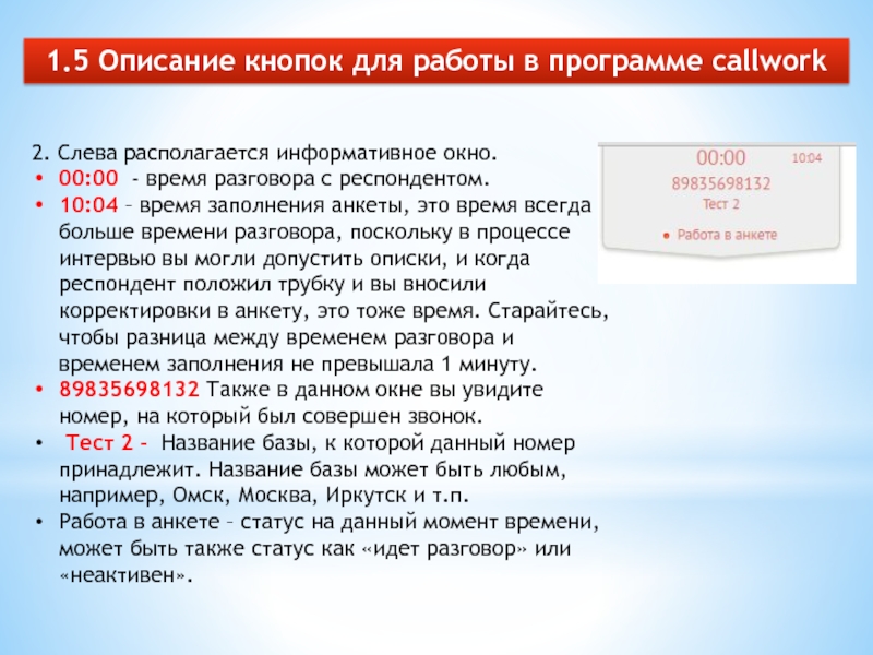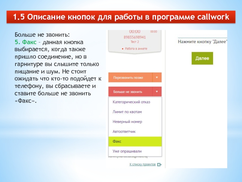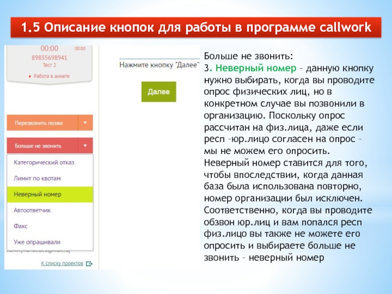 Слайд 281.5 Описание кнопок для работы в программе callwork