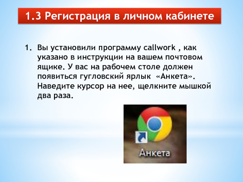 в инструкции на вашем почтовом ящике. У вас на рабочем столе должен появиться гугловский ярлык «Анкета». Наведите курсор на нее, щелкните мышкой два раза.