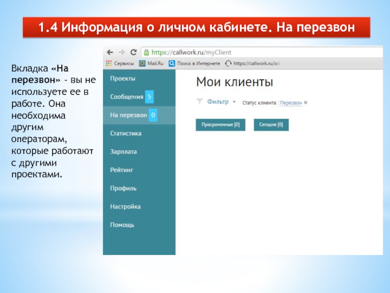 Слайд 181.4 Информация о личном кабинете. На перезвон