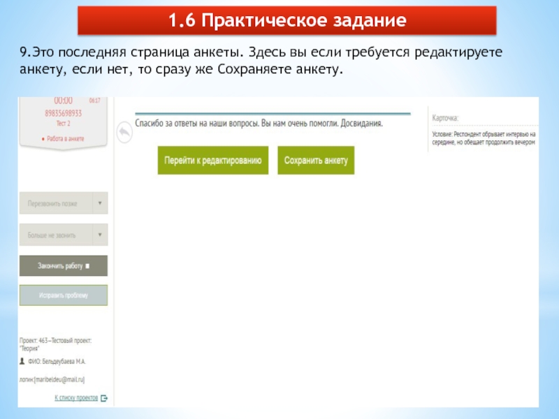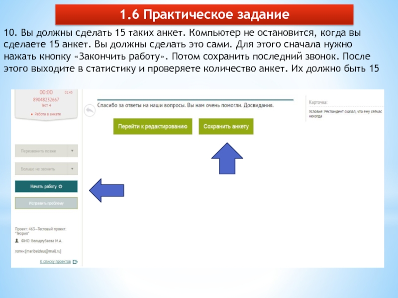 вы сделаете 15 анкет. Вы должны сделать это сами. Для этого сначала нужно нажать кнопку «Закончить работу». Потом сохранить последний звонок. После этого выходите в статистику и проверяете количество анкет. Их должно быть 15